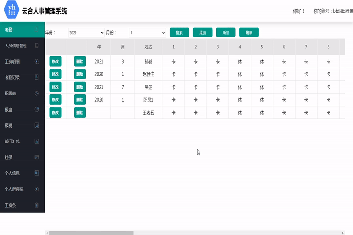 此模塊用于記錄員工每月的出勤情況,方便管理者計算員工工資。可以根據時間查詢以往考勤信息