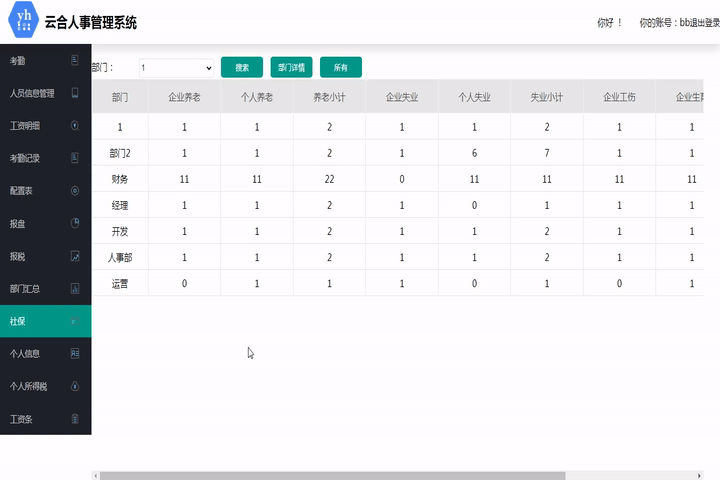 此模塊用于統計所有部門人員的繳納社保總金額,可查看某個部門的每位人員詳細情況。